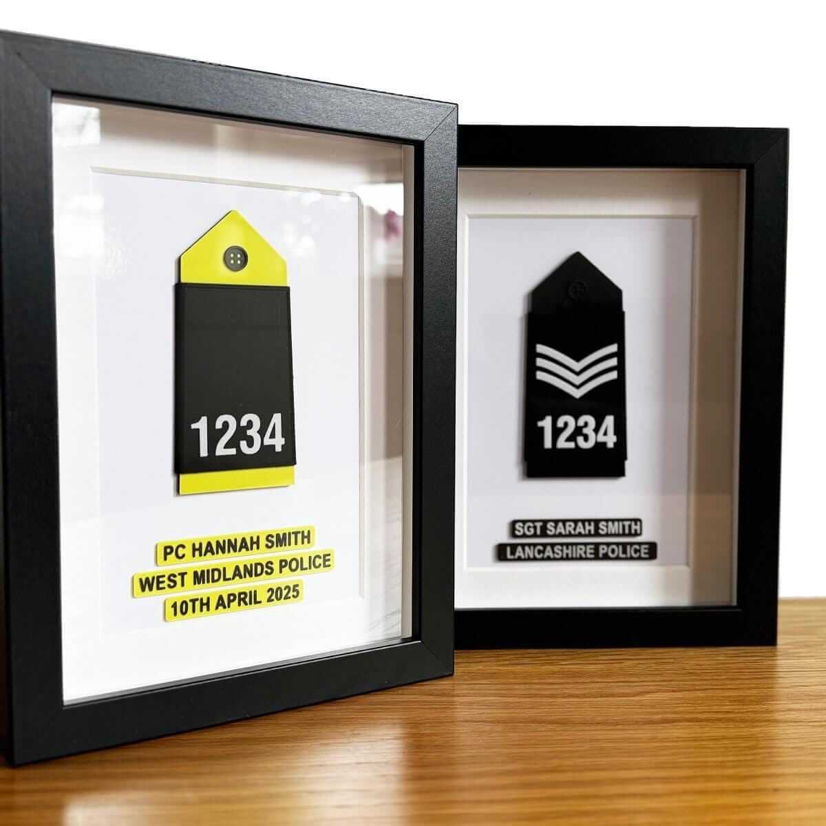 Designed, customised, and then 3D printed to a very high standard, this personalised United Kingdom police rank epaulette presentation frame is the perfect retirement gift for someone who has served in the force or is currently serving.