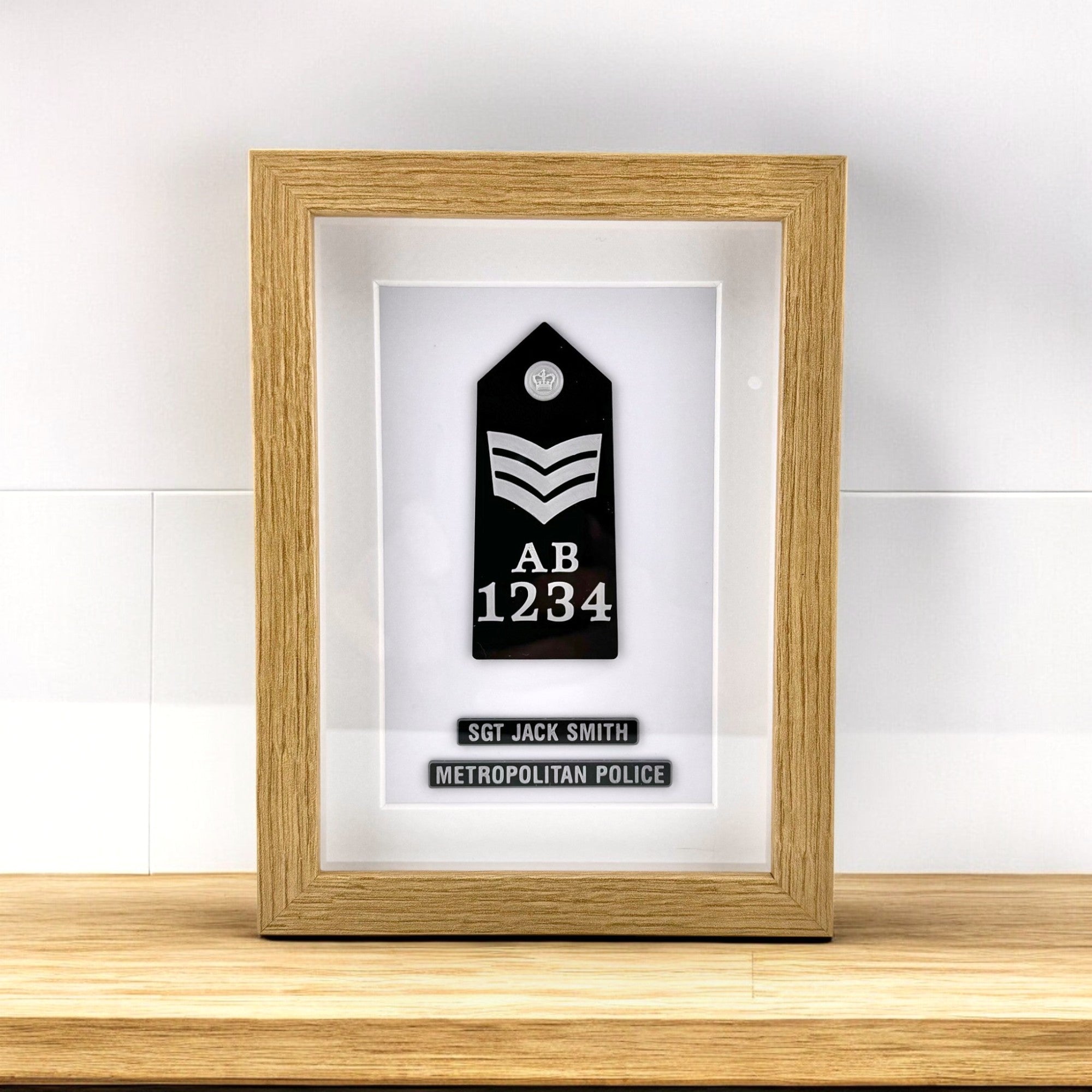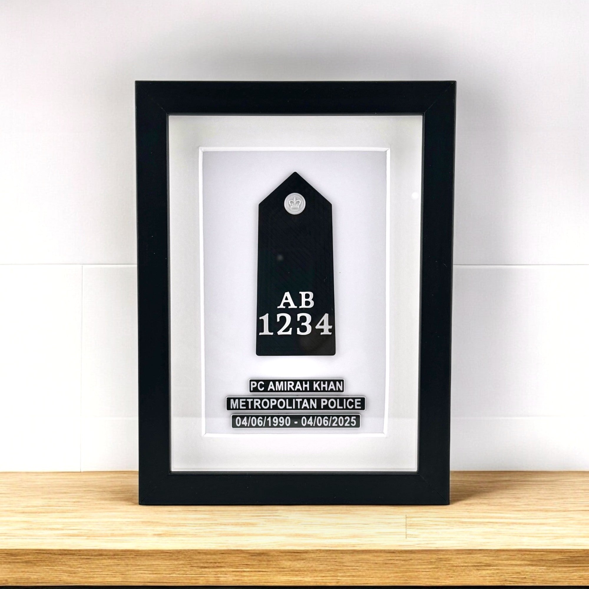 Designed, customized, and then 3D printed to a very high standard, this personalised Met Police rank epaulette presentation frame is the perfect gift for someone who has served in the force or is currently serving.